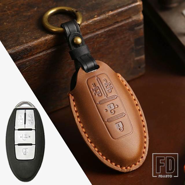 日産 本革キーケース クエスト MPV エルグランド NV200 エヴァリアセレナ 4ボタン リモート FOB スキンバッグキーホルダーキーカバー - Brown